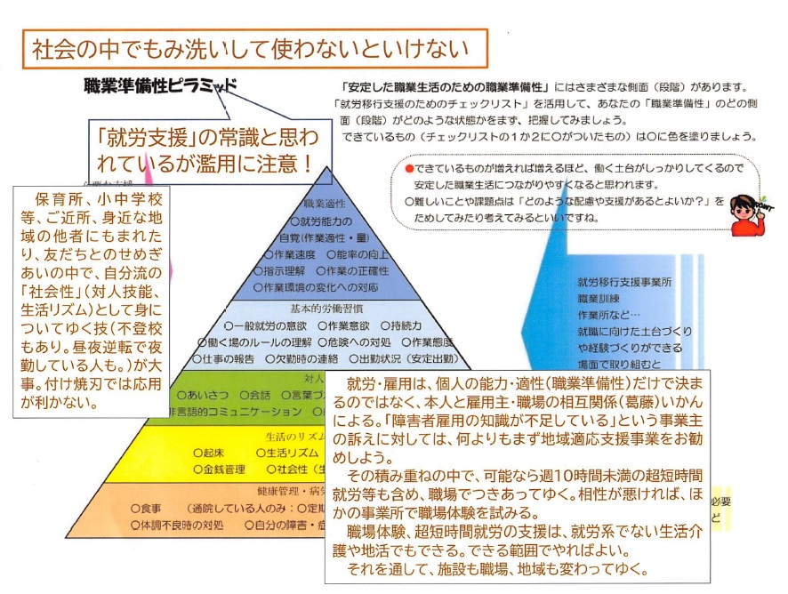 | 【当日配布の資料集】 ▽定期総会記念シンポジウム(PDF版) 職場参加からさぐる地域共生―― 障害福祉サービス参入から5年・ 越谷市障害者地域適応支援事業から 22年のいまをみつめる ・主催:NPO法人障害者の職場参加を すすめる会(代表理事“尾谷英一) 〒343-0023 越谷市東越谷1-1-7須賀ビル 職場参加ビューロー世一緒内 048-964-1819(TEL&FAX要9回コール) shokuba@deluxe.ocn.ne.jp ・6月18日(日)14:30-16:30受付14:20- 越谷市中央市民会館5階2,3会議室 ・会費(資料代):会員500円非会員700円 手話通訳有 後援:越谷市 春日部市 |